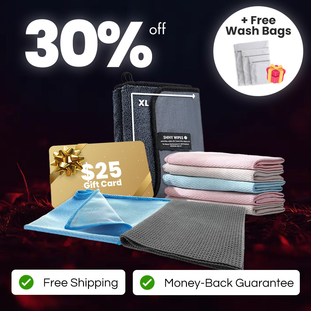 Everything you need to clean, dry, and polish your home to a sparkling shine. The Dry & Shine Bundle includes our Shiny Bath™ XL Drying Towel, a set of 5 All-Purpose Cloths, the XL Window Cloth, and the Glass Polishing Cloth - plus a $25 USD Shiny Wipes™ gift card! Get 30% off compared to buying individually, plus enjoy free shipping, a 30-day money-back guarantee, and a free set of washing bags to keep your cloths in top shape.
